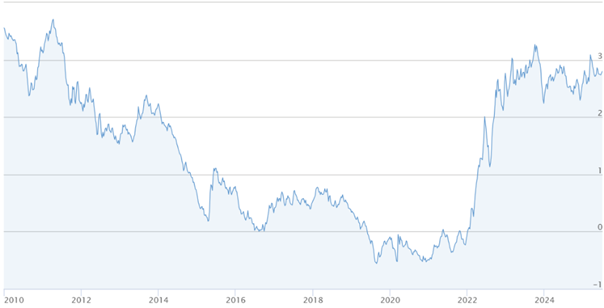 De rente voor een 10-jarige lening bedraagt per juli 2025 2,81% de verwachting is dat deze voor 2026 licht zal dalen.
